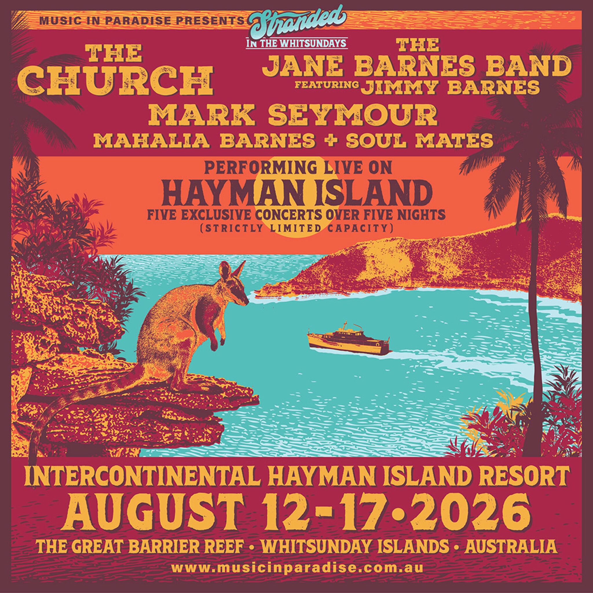 Join The Church for 2 incredibly intimate sunset concerts, The Jane Barnes band (featuring Jimmy) play 1 concert, Mark Seymour plays 1 concert, and Mahalia Barnes and The Soul Mates also play 1 show.